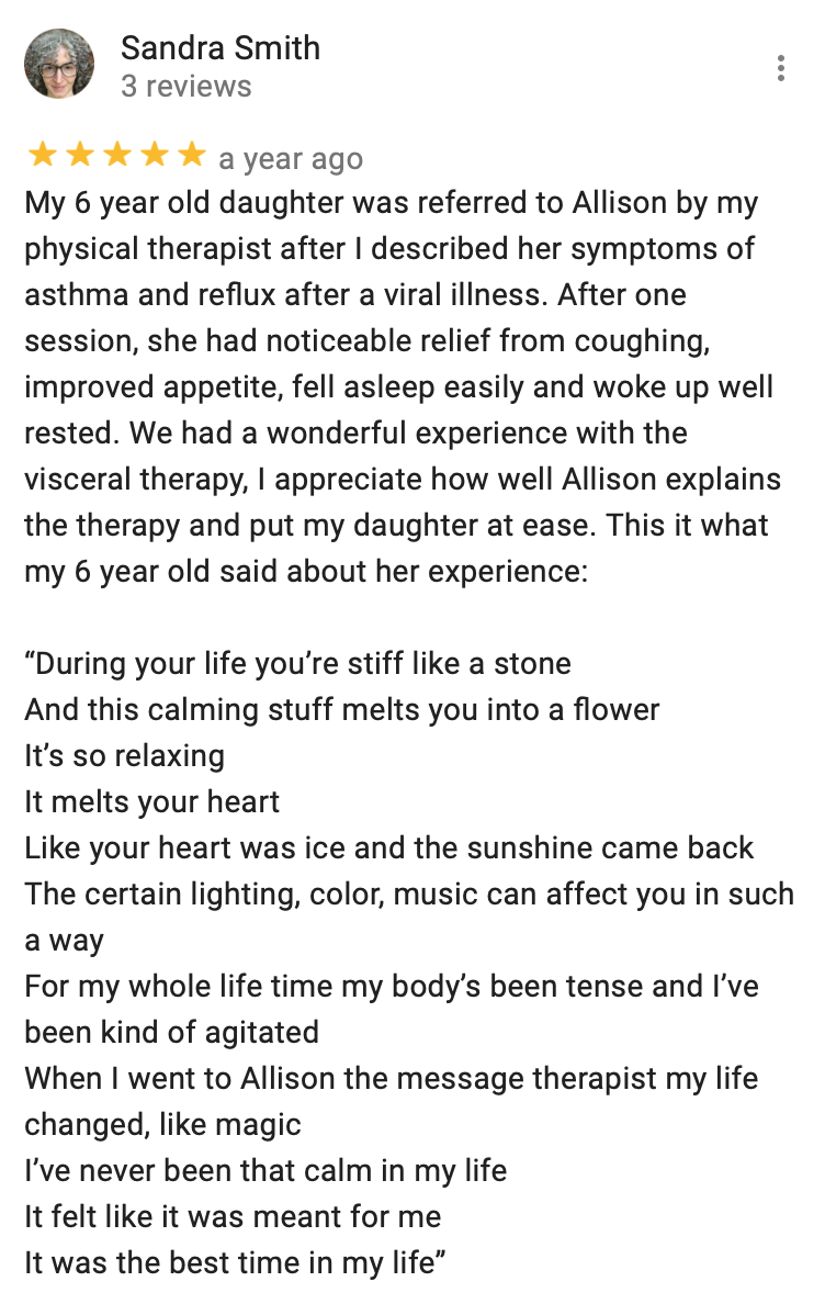On average, our clients improvement in their symptoms or condition in 1-3 sessions of Craniosacral Therapy or Visceral Manipulation.
